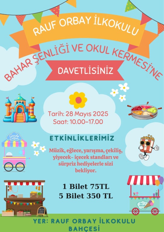 Okul Aile Birliğimiz'in düzenlemiş olduğu Bahar Şenliği ve Kermesine davetlisiniz. Tüm öğrencilerimizi ve velilerimizi 28 MayısÇarşamba günü saat 10.00-17.00 arasında okulumuzun bahçesine bekliyoruz.